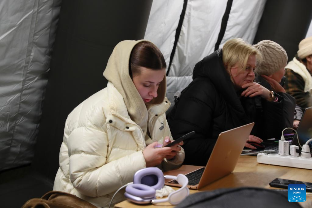 People use their laptops at a temporary shelter in Kiev, Ukraine, Jan. 20, 2026. [Photo/Xinhua]