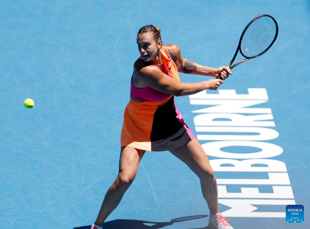Aryna Sabalenka of Belarus hits a return during the women's singles 2nd round match against Bai Zhuoxuan of China at the Australian Open tennis tournament in Melbourne, Australia, Jan. 21, 2026. (Xinhua/Ma Ping)