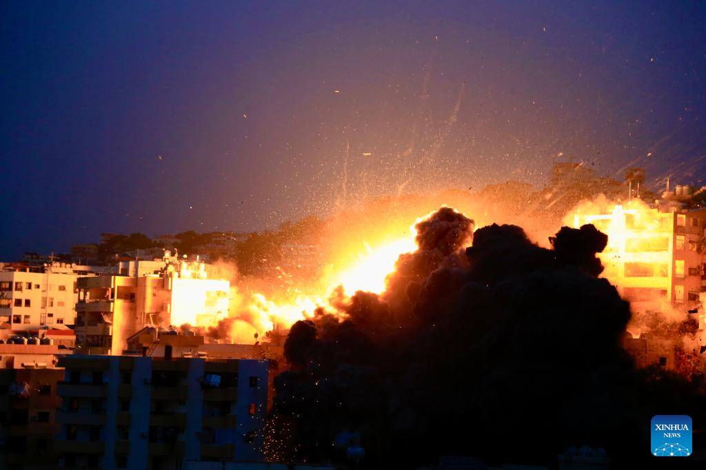 Photo taken on Jan. 21, 2026 shows explosions during Israeli airstrikes in Qennarit, near Sidon, southern Lebanon. [Photo/Xinhua]