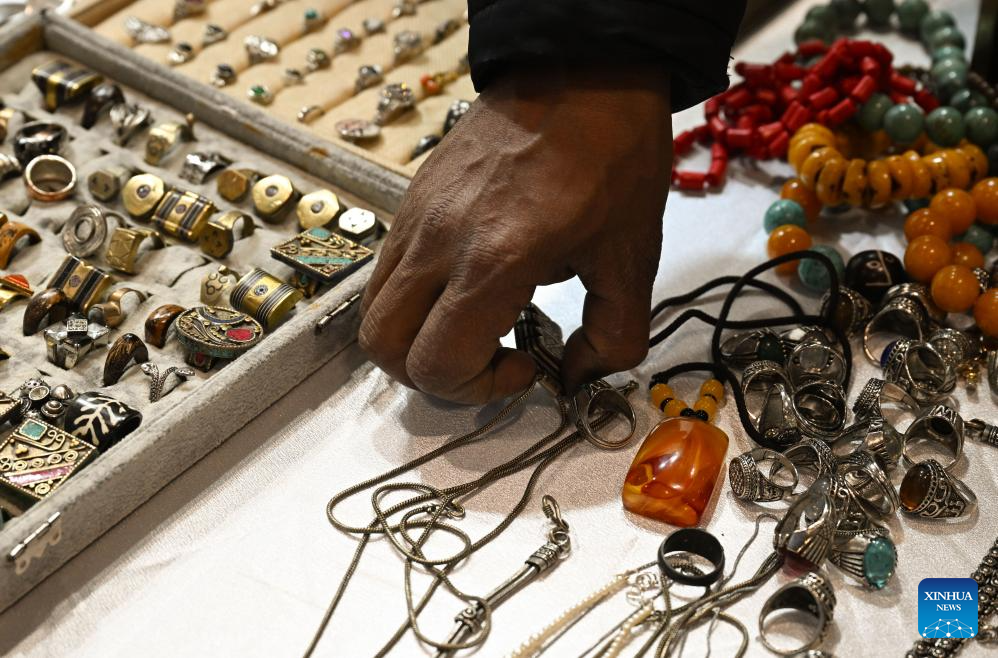 This photo taken on Jan. 21, 2026 shows the traditional handicrafts at the booth of Mauritania during the 2026 FITUR international tourism exhibition in Madrid, Spain. The 2026 FITUR international tourism exhibition opened on Wednesday in Madrid, showcasing the latest development, innovative trends and cooperation opportunities in the tourism industry. This year's fair has attracted over 10,000 companies and nearly 1,000 exhibitors from 161 countries and regions, with 255,000 attendees expected over the five days. (Xinhua/Cheng Min)