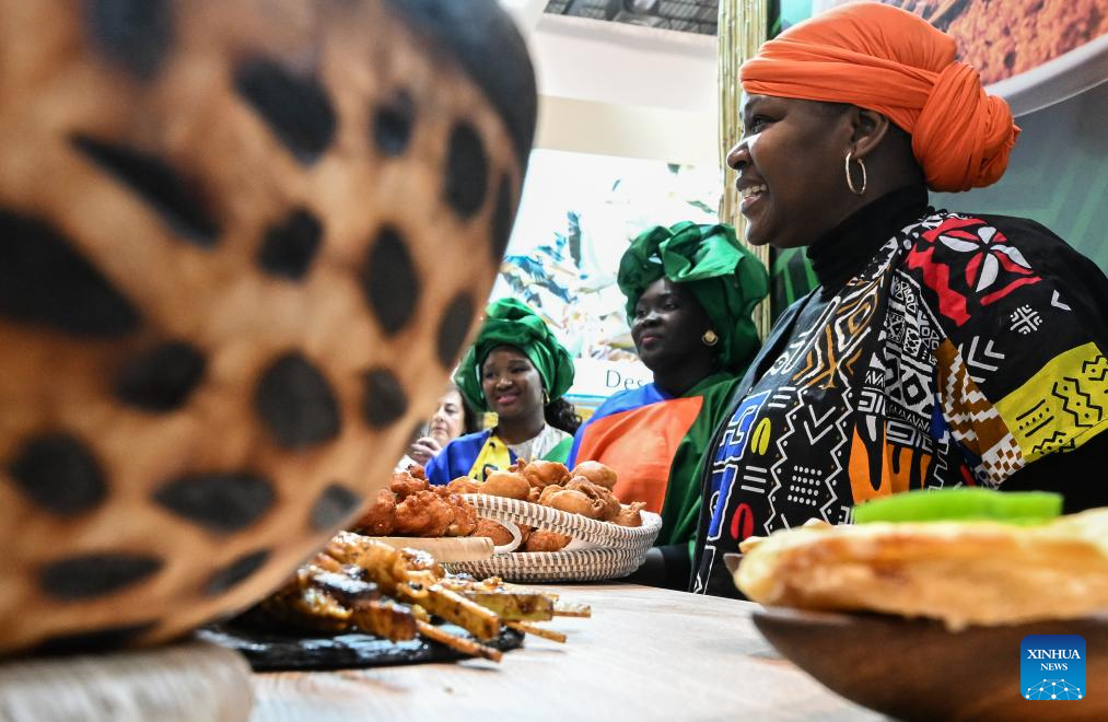 Staff members offer visitors traditional snack at the exhibition area of Senegal during the 2026 FITUR international tourism exhibition in Madrid, Spain, Jan. 21, 2026. The 2026 FITUR international tourism exhibition opened on Wednesday in Madrid, showcasing the latest development, innovative trends and cooperation opportunities in the tourism industry. This year's fair has attracted over 10,000 companies and nearly 1,000 exhibitors from 161 countries and regions, with 255,000 attendees expected over the five days. (Xinhua/Cheng Min)