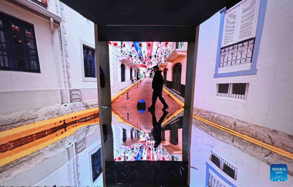 A visitor walks past a display installation during the 2026 FITUR international tourism exhibition in Madrid, Spain on Jan. 21, 2026 The 2026 FITUR international tourism exhibition opened on Wednesday in Madrid, showcasing the latest development, innovative trends and cooperation opportunities in the tourism industry. This year's fair has attracted over 10,000 companies and nearly 1,000 exhibitors from 161 countries and regions, with 255,000 attendees expected over the five days. (Xinhua/Cheng Min)