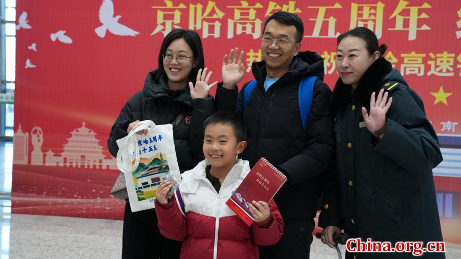 A family poses for a group photo holding commemorative gifts with a train attendant after taking part in activities marking the fifth anniversary of the opening of the Beijing-Harbin HSR at Chengdenan Railway Station in Chengde, Hebei province, Jan. 22, 2026. [Photo by Zhang Yuxin/China.org.cn]