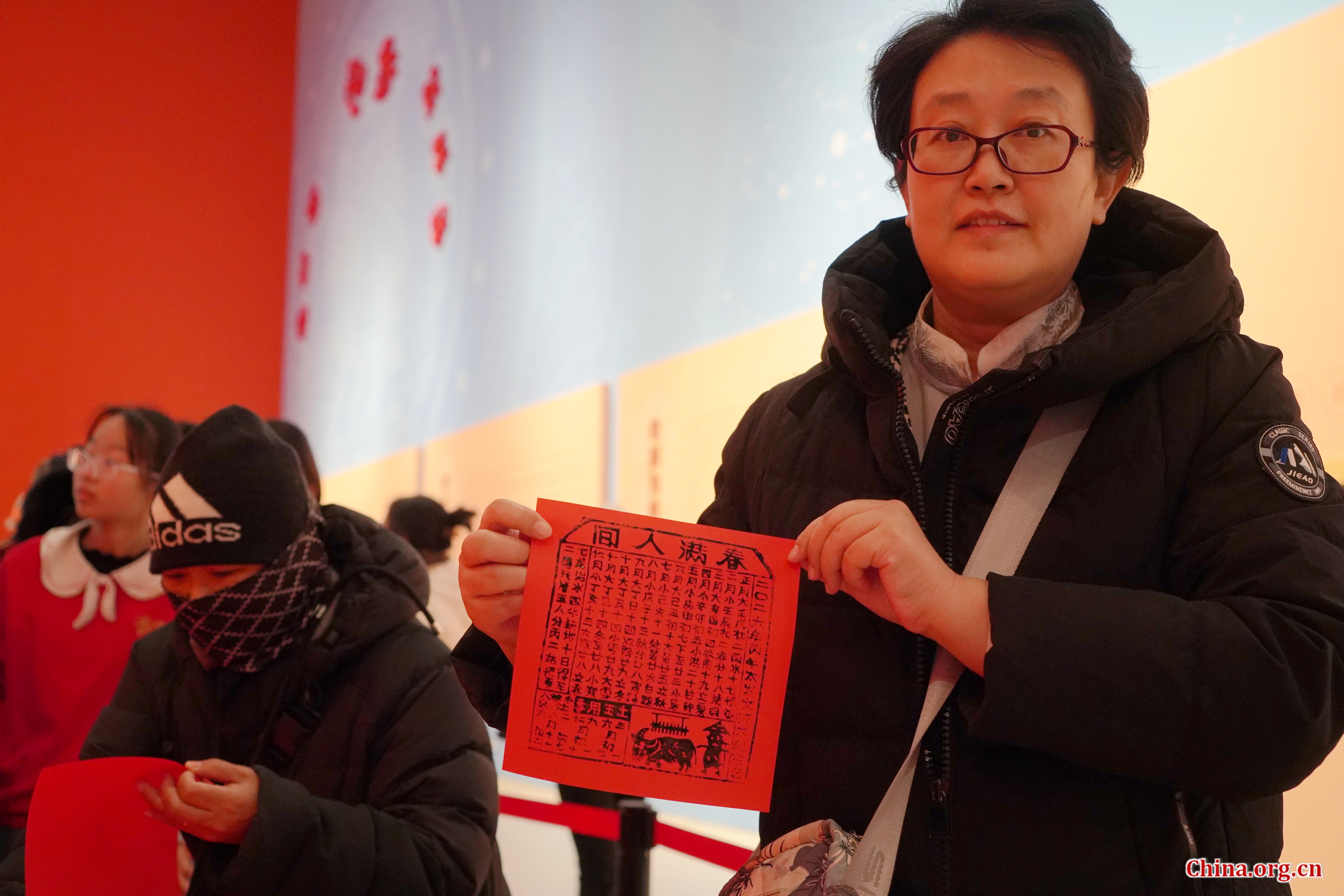 A visitor displays a rubbing artwork during an interactive cultural session at the Chinese Traditional Culture Museum in Beijing, Jan. 21, 2026. [Photo by Wang Yiming/China.org.cn]