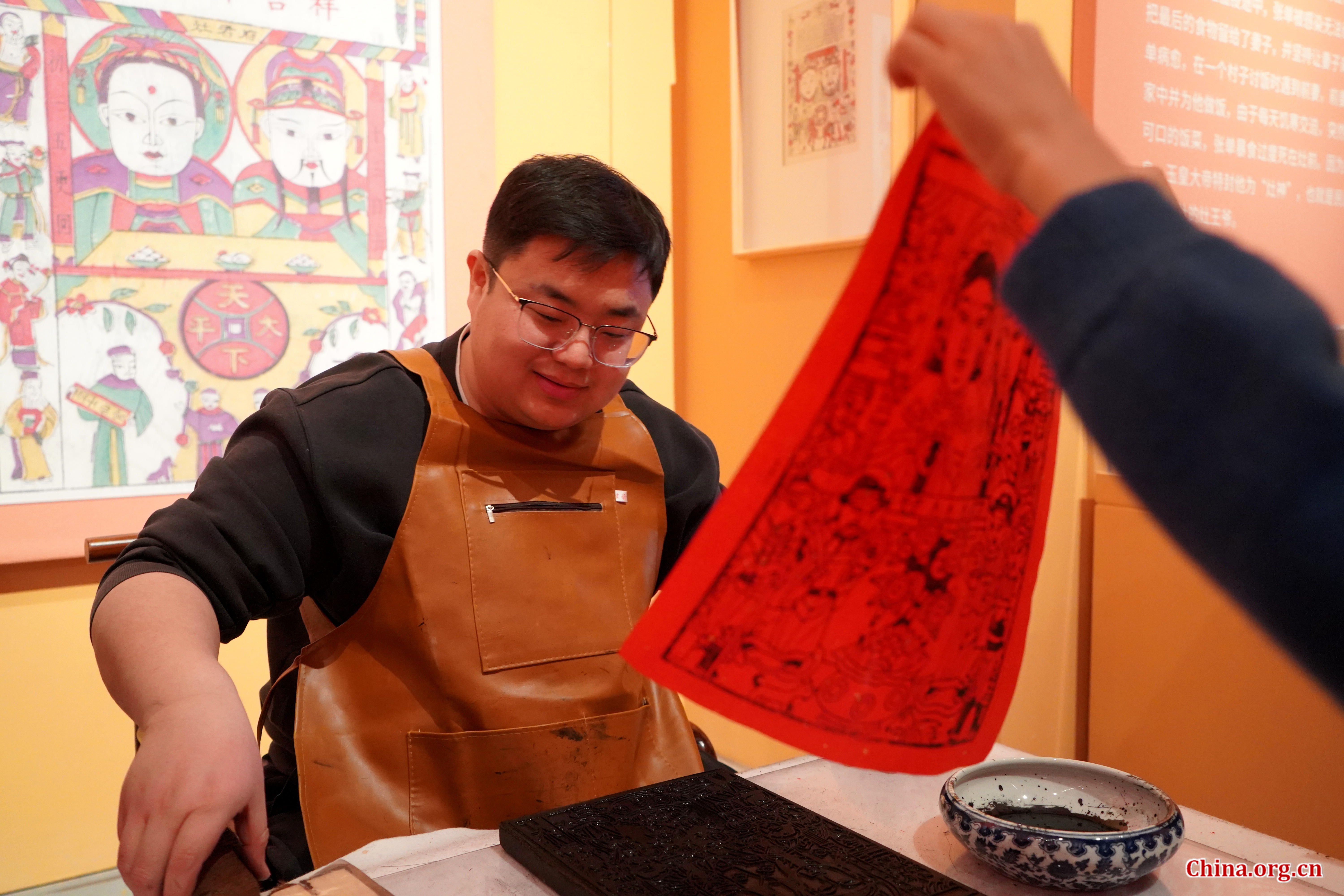 A craftsman and a rubbing artwork of the Kitchen God at the Chinese Traditional Culture Museum in Beijing, Jan. 21, 2026. [Photo by Wang Yiming/China.org.cn]
