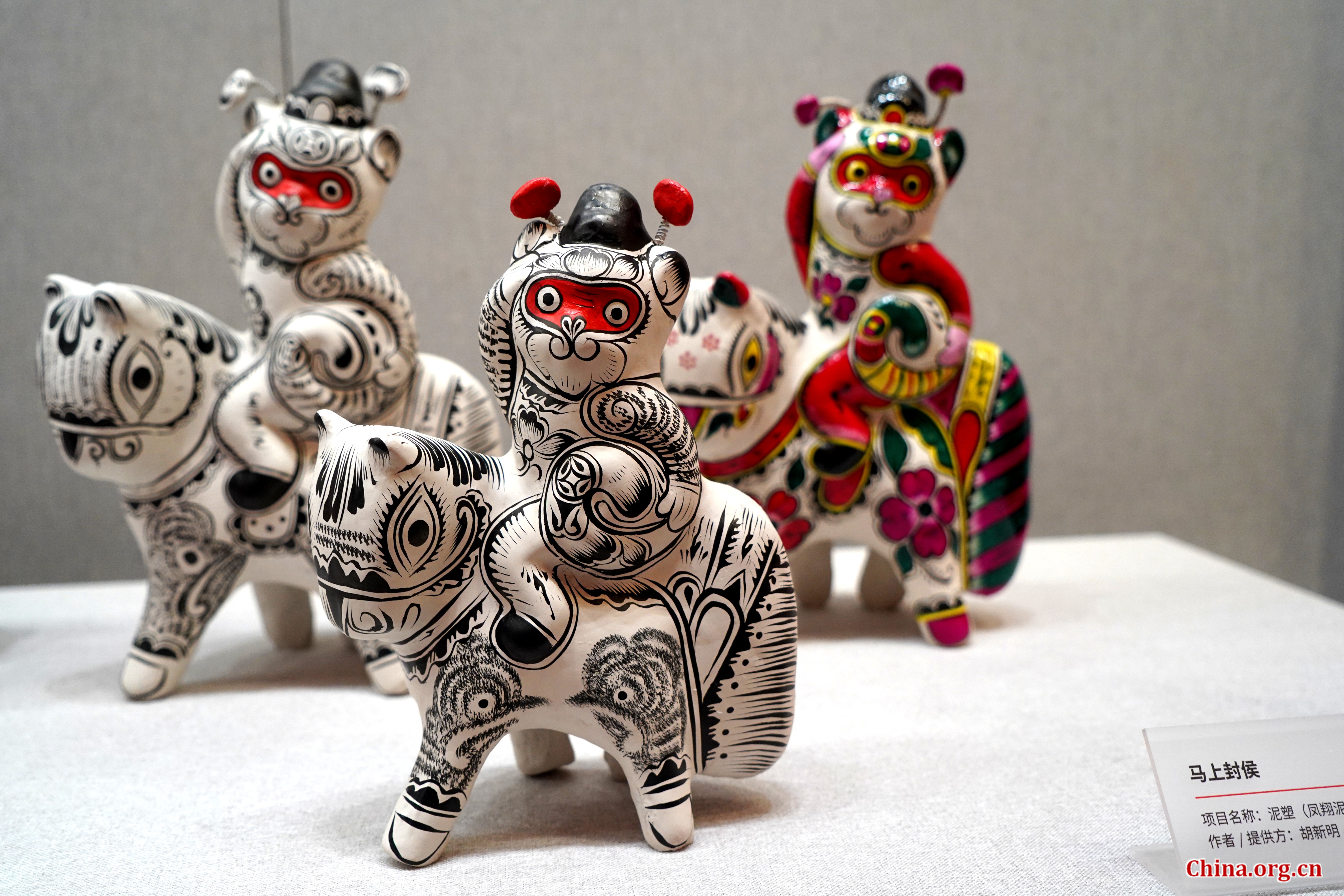 Fengxiang clay sculptures depicting "monkeys riding horses" ("ma shang feng hou"), a symbol of career success in Chinese culture, on display at the Chinese Traditional Culture Museum in Beijing, Jan. 21, 2026. [Photo by Wang Yiming/China.org.cn]