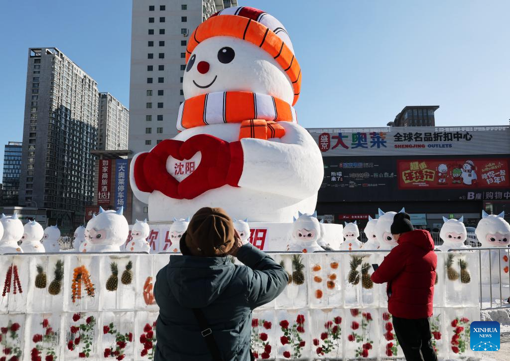 A giant snowman is seen in front of a shopping mall in Shenyang, northeast China's Liaoning Province, Jan. 22, 2026. (Xinhua/Li Gang)
