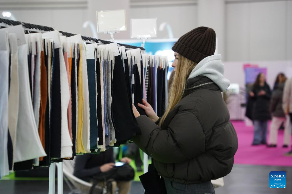 A visitor checks textile samples at a booth of Texworld NYC, a textile sourcing trade show, in New York City, the United States, on Jan. 20, 2026. Multiple rounds of tariffs and growing policy uncertainty are reshaping global textile sourcing, placing mounting pressure on manufacturers and brands.(Photo by Li Xirui/Xinhua)