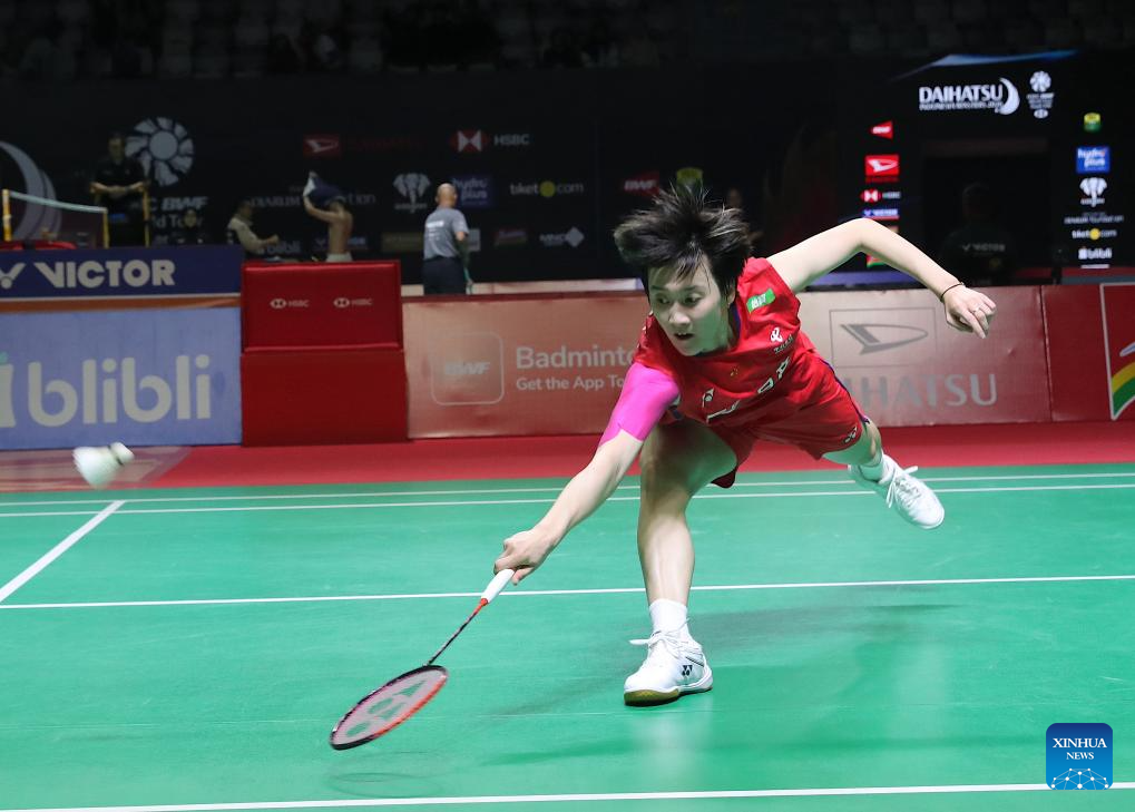 Chen Yufei of China hits a return during the women's singles quarterfinal match between Chen Yufei of China and Pusarla V. Sindhu of India at the Indonesia Masters 2026 badminton tournament in Jakarta, Indonesia, Jan. 23, 2026. (Xinhua/Cen Yunpeng)