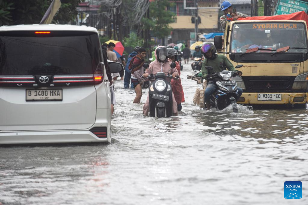 People ride motorbikes through floodwaters in Tangerang, Banten Province, Indonesia, Jan. 23, 2026. (Photo by Agung Kuncahya B./Xinhua)