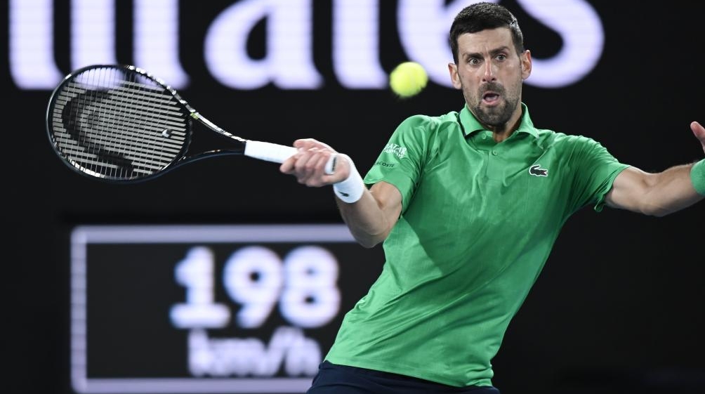 Novak Djokovic hits a return during the men's singles 3rd round match between Novak Djokovic of Serbia and Botic van de Zandschulp of the Netherlands at the Australian Open tennis tournament in Melbourne, Australia, Jan. 24, 2026. [Photo/Xinhua]