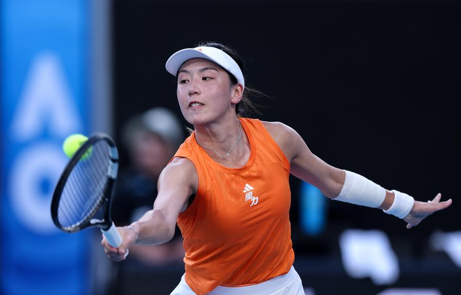 Wang Xinyu hits a return during her women's singles 3rd round win against Linda Noskova at the 2026 Australian Open in Melbourne, Jan. 24, 2026. [Photo/Xinhua]