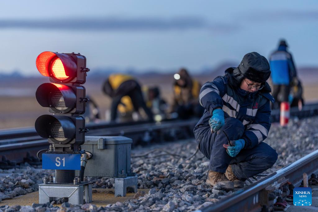 Since its establishment in 2018, the section has been responsible for maintaining and repairing signal equipment at three high-altitude stations -- Tanggula South, Za'gya Zangbo and Xuechama. Ten young workers from various ethnic groups, including the Han, Tibetan and Mongolian, are currently on duty here. With an average age of under 32, they brave extreme conditions to keep the railway operating safely, ensuring the smooth flow of trains during the upcoming Spring Festival travel rush and the long term. (Xinhua/Tenzing Nima Qadhup)