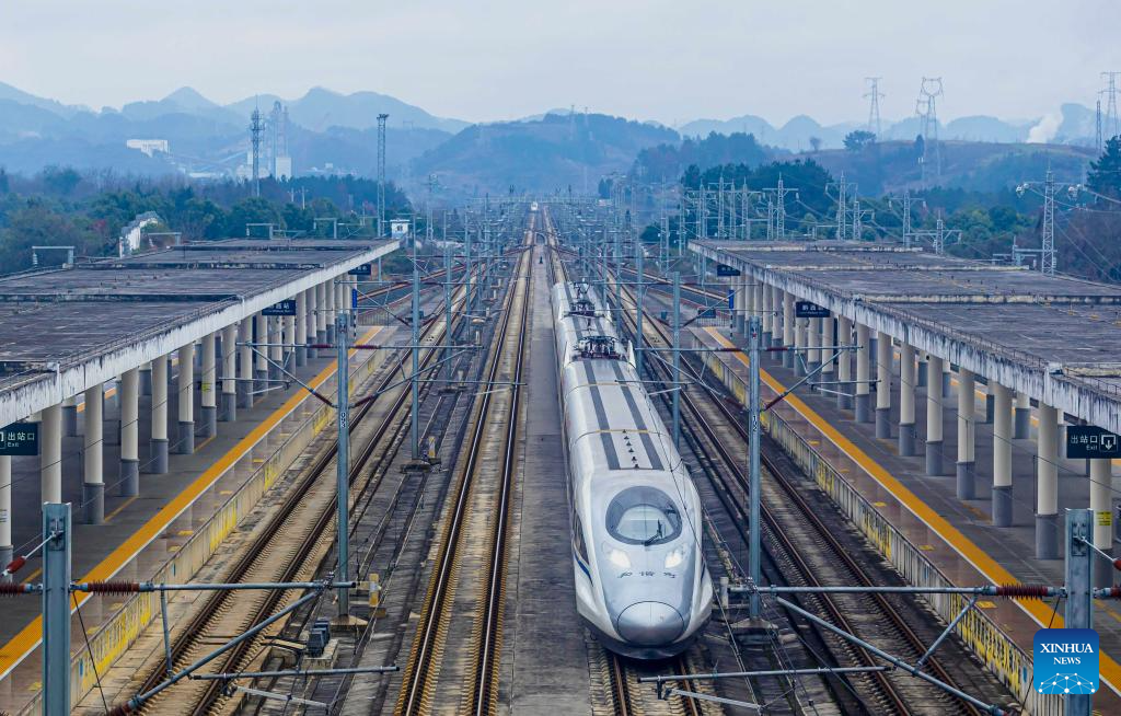 A bullet train runs past the Qianxi Railway Station in Qianxi, southwest China's Guizhou province, Jan. 25, 2026. A new train schedule is put into effect in China from Jan. 26. 2026. (Photo by Fan Hui/Xinhua)