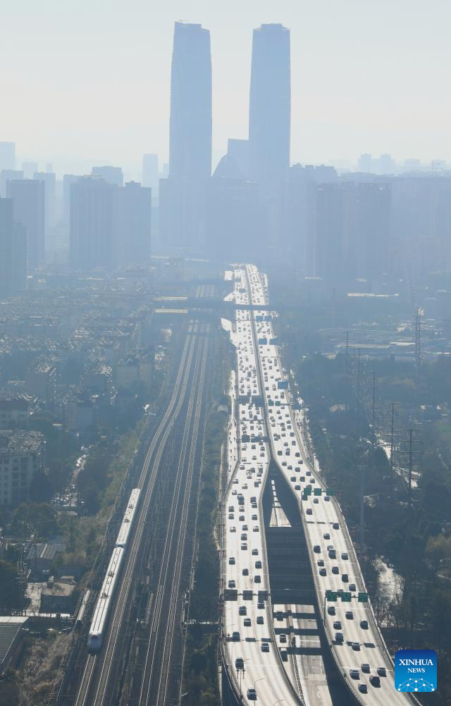 A bullet train (lower L) runs in the urban area of Kunming City, southwest China's Yunnan province, Jan. 25, 2026. A new train schedule is put into effect in China from Jan. 26. 2026. (Photo by Zheng Yi/Xinhua)