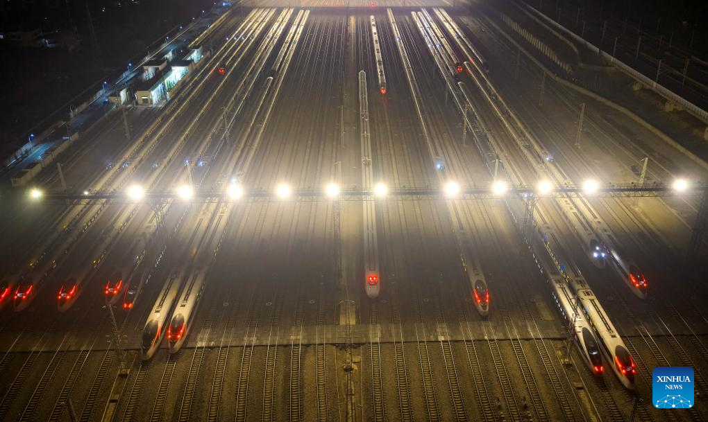 A drone photo taken on Jan. 25, 2026 shows bullet trains parking at a bullet train depot in Nanjing City, east China's Jiangsu province. A new train schedule is put into effect in China from Jan. 26. 2026. (Photo by Yang Suping/Xinhua)