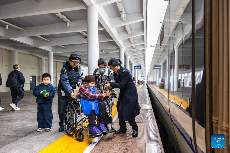 Train stewards help a senior passenger broad a train at Anshun West Railway Station in Anshun City, southwest China's Guizhou province, Jan. 25, 2026. A new train schedule is put into effect in China from Jan. 26. 2026. (Photo by Chen Xi/Xinhua)