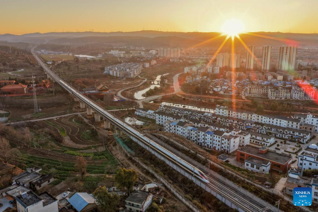 A drone photo taken on Jan. 25, 2026 shows a bullet train running in Qujing City, southwest China's Yunnan province. A new train schedule is put into effect in China from Jan. 26. 2026. (Photo by Sun Wenlai/Xinhua)