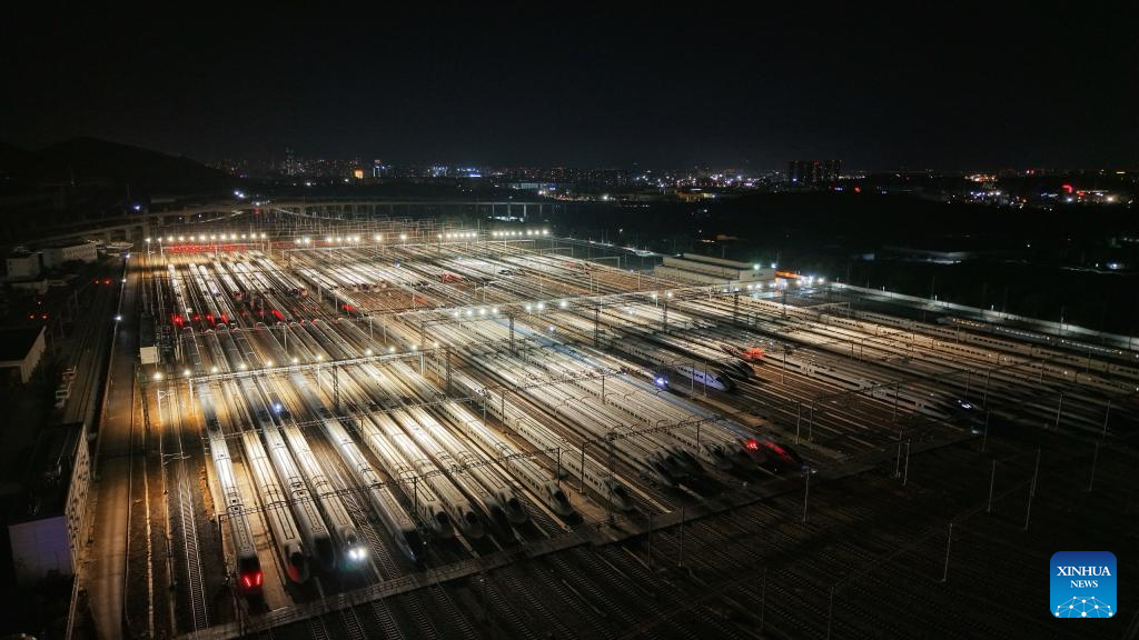 An aerial drone photo taken on Jan. 25, 2026 shows the bullet trains at a depot in Kunming, southwest China's Yunnan province. A new train schedule is put into effect in China from Jan. 26. 2026. (Photo by Yang Zixuan/Xinhua)