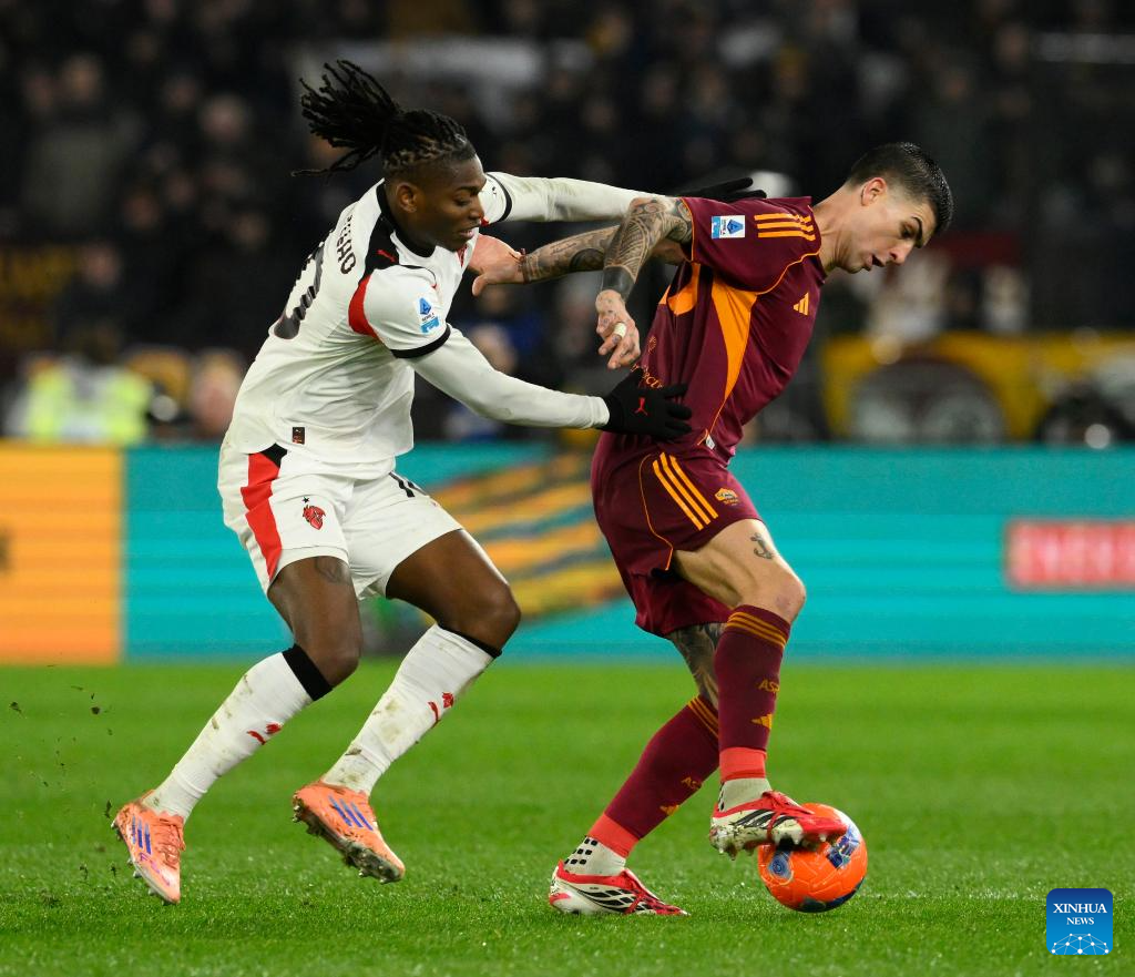Roma's Gianluca Mancini (R) vies with AC Milan's Rafael Leao during a Serie A soccer match between Roma and AC Milan in Rome, Italy, Jan. 25, 2026. (Photo by Alberto Lingria/Xinhua)