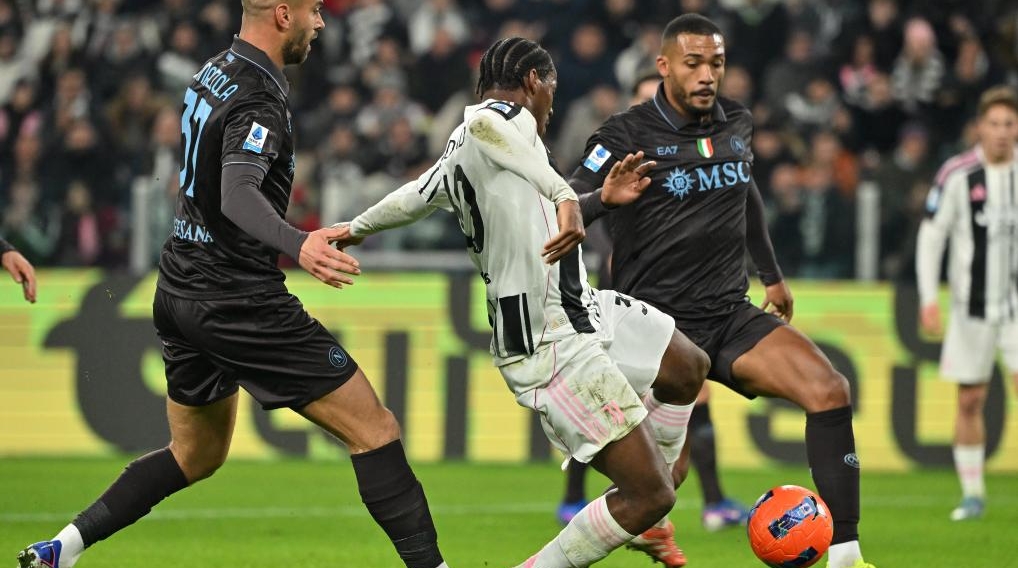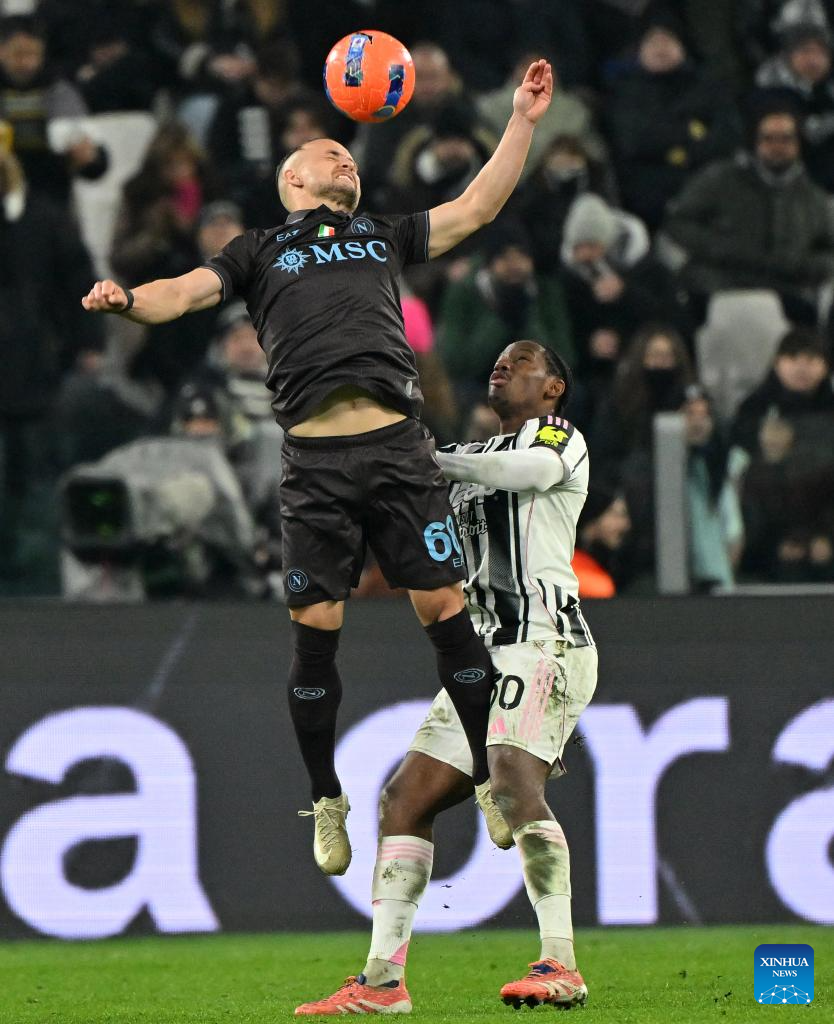 Juventus' Jonathan David (R) vies with Napoli's Stanislav Lobotka during a Serie A soccer match between Juventus and Napoli in Turin, Italy, Jan. 25, 2026. (Xinhua)