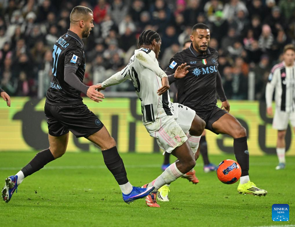 Juventus' Jonathan David (C) scores during a Serie A soccer match between Juventus and Napoli in Turin, Italy, Jan. 25, 2026. (Xinhua)