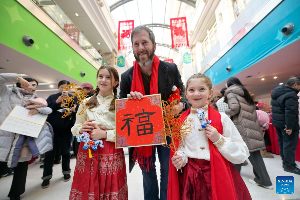 Tourists pose for photos during a temple fair for children in north China's Tianjin, on Jan. 24, 2026. A special temple fair tailored for children kicked off in north China's Tianjin on Saturday. Crowds of parents and kids gathered at the fair to experience the festive atmosphere ahead of the Spring Festival. The event features a variety of activities including traditional handicraft making, Tianjin-style food tasting, and interactive games. (Xinhua/Zhao Zishuo)