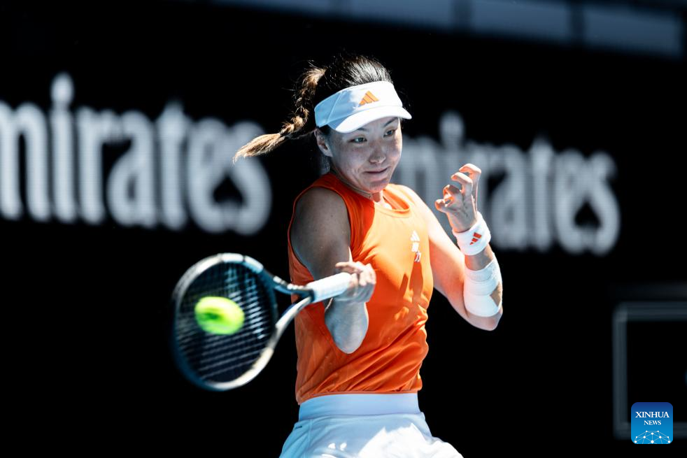 Wang Xinyu of China hits a return during the women's singles 4th round match between Wang Xinyu of China and Amanda Anisimova of the United States at the Australian Open tennis tournament in Melbourne, Australia, Jan. 26, 2026. (Photo by Hu Jingchen/Xinhua)