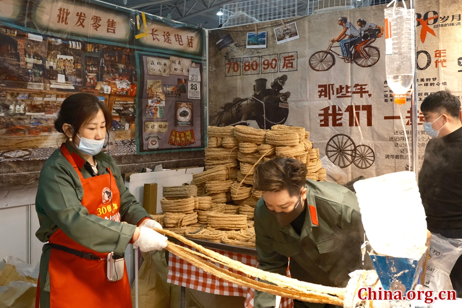 Vendors prepare crispy baked yam snacks from Shandong province on-site at the fair in Beijing, Jan. 25, 2026. [Photo by Liao Jiaxin/China.org.cn]