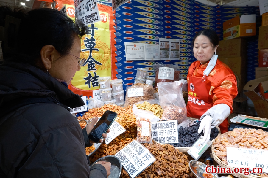 A visitor shops for assorted dried fruits and preserves from Xinjiang Uygur Autonomous Region at the fair in Beijing, Jan. 25, 2026. [Photo by Liao Jiaxin/China.org.cn]