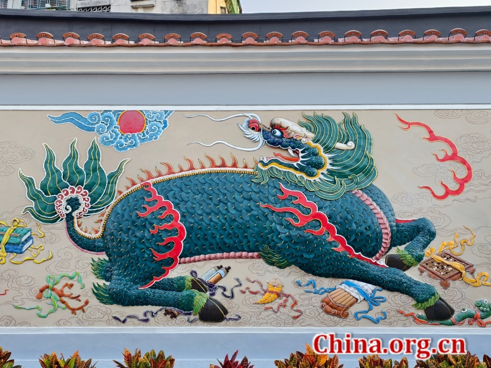 An intricate inlaid porcelain sculpture on a wall in front of a building in Chaozhou, Guangdong province, Jan. 23, 2026. [Photo by Gong Yingchun/China.org.cn]