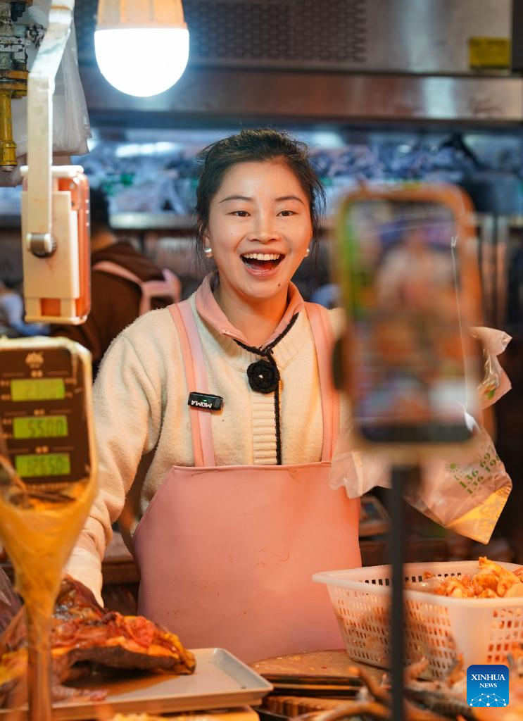 A vendor sells chicken via live-streaming at Daguan Zhuanxin farmers' market in Kunming, southwest China's Yunnan Province, Jan. 27, 2026. While preserving the original function of a farmers' market, Daguan Zhuanxin farmers' market has now been upgraded to a complex of cultural experience, dining and entertainment, which offers tourists a window to experience local flavor and vibe. (Xinhua/Chen Xinbo)