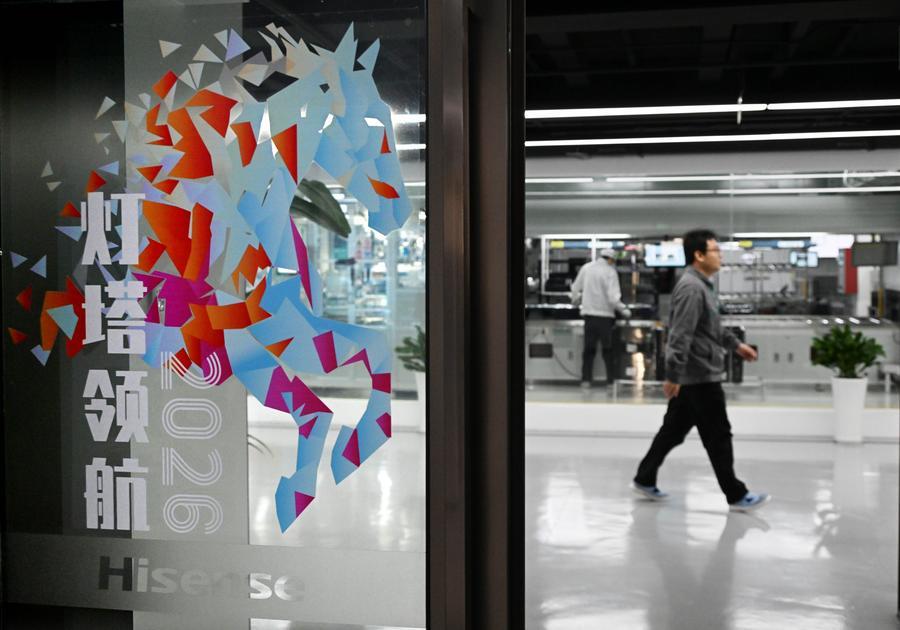 A staff member of Hisense Visual Technology walks past a production line in Qingdao, east China's Shandong Province, Jan. 13, 2026. [Photo/Xinhua]