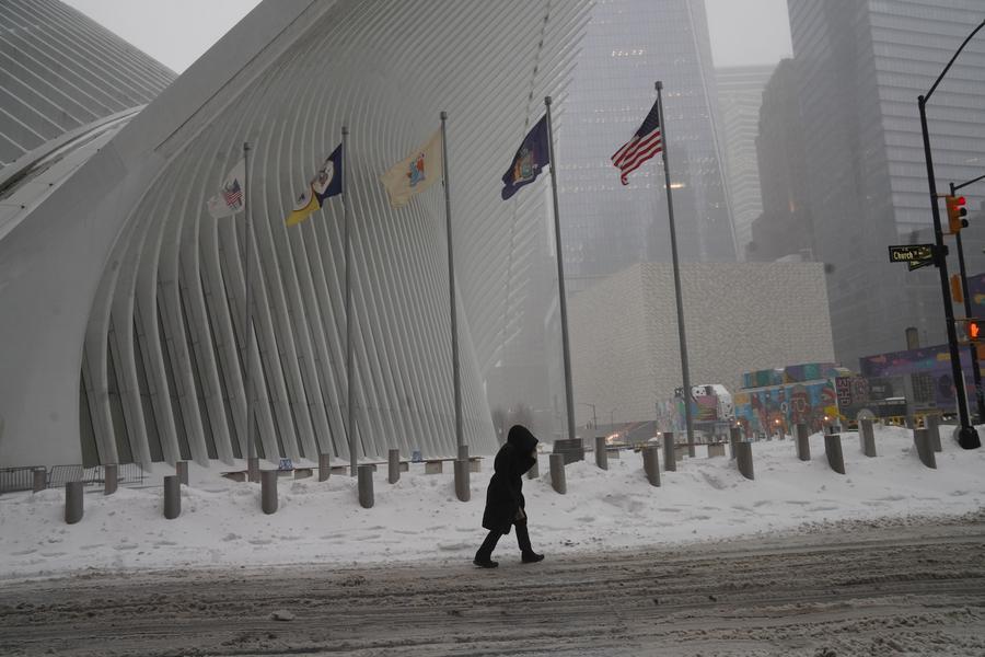 A pedestrian walks past the World Trade Center subway station amid snow in New York, the United States, on Jan. 25, 2026. [Photo/Xinhua]