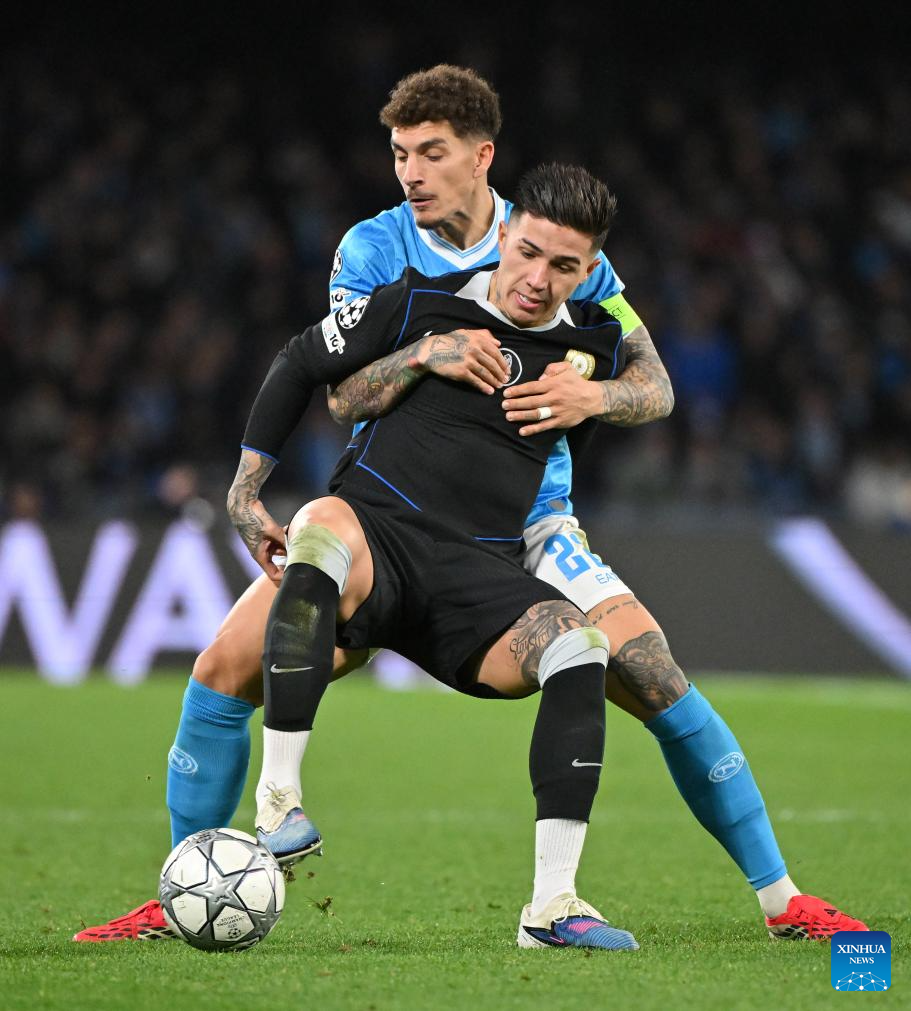 Napoli's Giovanni Di Lorenzo (back) vies with Chelsea's Enzo Fernandez during the UEFA Champions League football match between Napoli and Chelsea in Naples, Italy, Jan. 28, 2025. (Photo by Alberto Lingria/Xinhua)