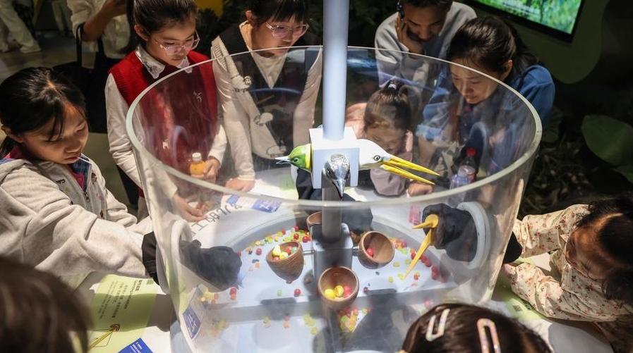People play a game of imitating birds feeding at the Hainan Science and Technology Museum in Haikou, south China's Hainan province, Jan. 15, 2026. [Photo/Xinhua]