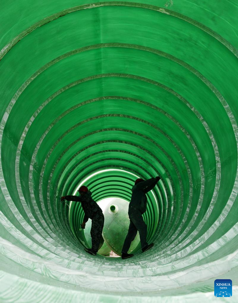 Workers make polluted-water processing devices at a water environmental engineering company in Nanmo Town of Hai'an City, east China's Jiangsu Province, Jan. 28, 2026. (Photo by Zhou Qiang/Xinhua)