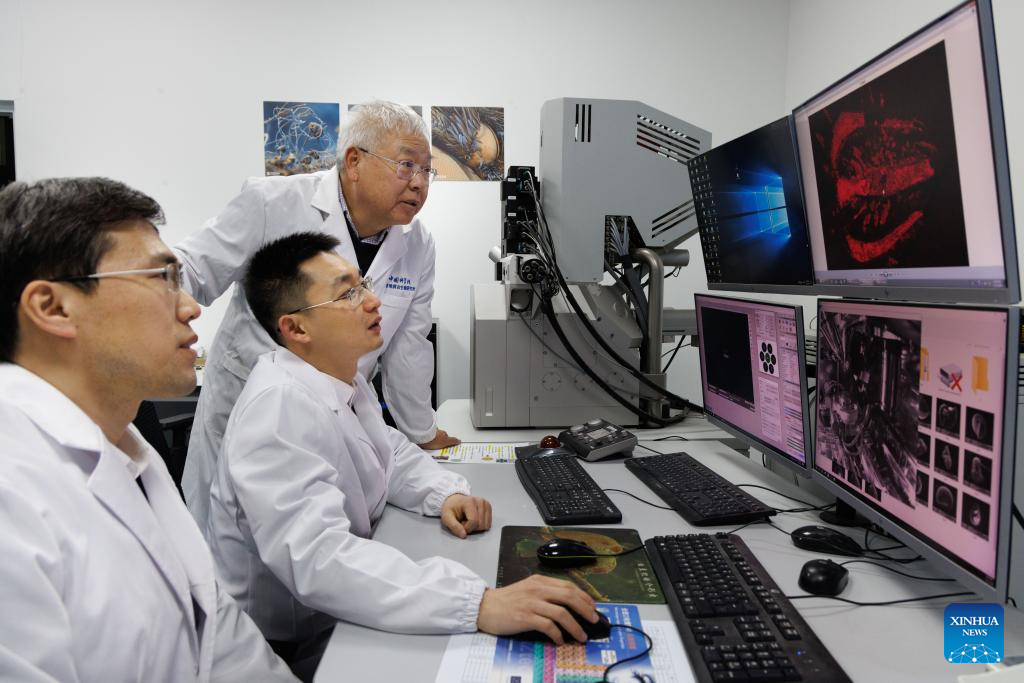Researchers Zhu Maoyan (back), Zhao Fangchen (front) and Zeng Han (C) observe a scanned fossil photo at a laboratory of Nanjing Institute of Geology and Palaeontology at the Chinese Academy of Sciences (NIGPAS) in Nanjing, east China's Jiangsu province, Jan. 22, 2026. (Xinhua/Jin Liwang)