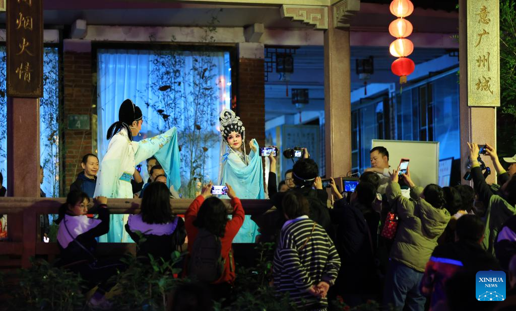 People watch a Cantonese opera performance during the 2026 Guangzhou Spring Festival lantern show in Guangzhou, south China's Guangdong Province, Jan. 30, 2026. The event kicked off at the Yuexiu Park in Guangzhou on Friday, featuring 85 groups of distinctive lantern displays scattered throughout the ten major tourist areas of the entire park, and will last until March, 8. [Xinhua/Wang Ruiping]