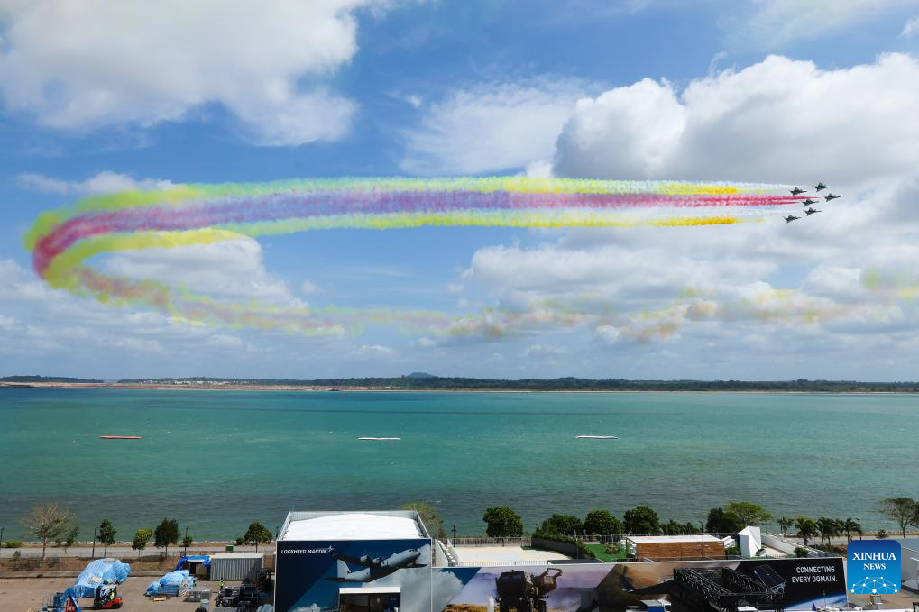 Aircraft of the Bayi Aerobatic Team of the Chinese People's Liberation Army (PLA) Air Force conduct training exercises for the 10th Singapore Airshow over the sea near Singapore's Changi Airport in Singapore, Jan. 30, 2026. [Photo/Xinhua]