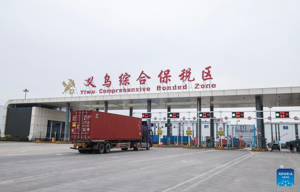 A container truck loaded with imported goods enters the Yiwu Comprehensive Bonded Zone for bonded storage, in Yiwu, east China's Zhejiang Province, Jan. 30, 2026. [Photo/Xinhua]
