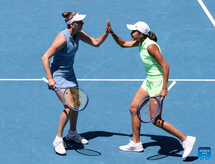 Zhang Shuai (R)/Elise Mertens celebrate scoring during the women's doubles final match between Zhang Shuai (China)/Elise Mertens (Belgium) and Anna Danilina (Kazakhstan)/Aleksandra Krunic (Serbia) at the Australian Open tennis tournament in Melbourne, Australia, Jan. 31, 2026. [Photo/Xinhua/Ma Ping]