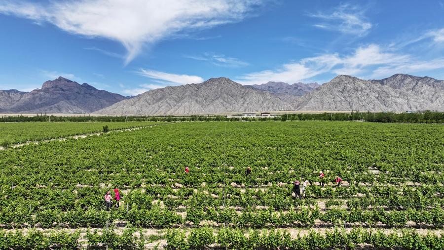 A drone photo shows a wine grape plantation in northwest China's Ningxia Hui Autonomous Region, on June 4, 2025. [Photo/Xinhua]