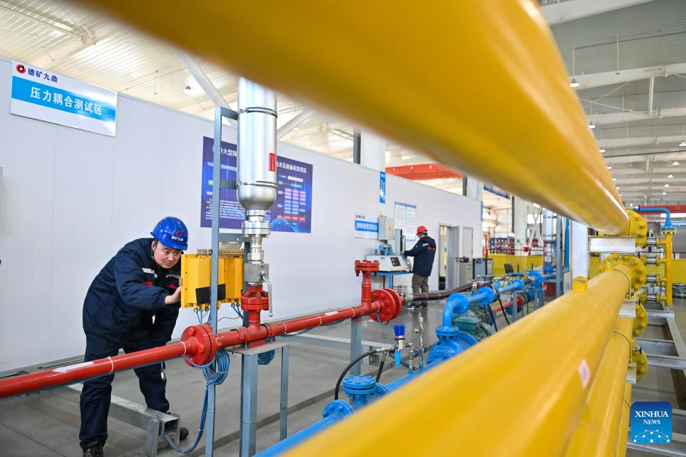 Staff members adjust a pilot test platform for a pressure coupling device at Dekuang Jiuding (Tianjin) Technology Co., Ltd. in the Beijing-Tianjin Zhongguancun Tech Town, in Tianjin, north China, Jan. 23, 2026. (Xinhua/Sun Fanyue)