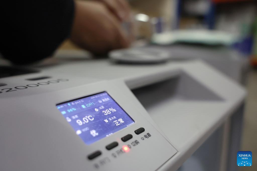 The LCD screen on the dedicated case for high-speed rail pet transportation displays real-time information on temperature, humidity, and oxygen concentration at Lanzhou West Railway Station, in Lanzhou, northwest China's Gansu Province, Feb. 1, 2026. (Xinhua/Chen Bin)