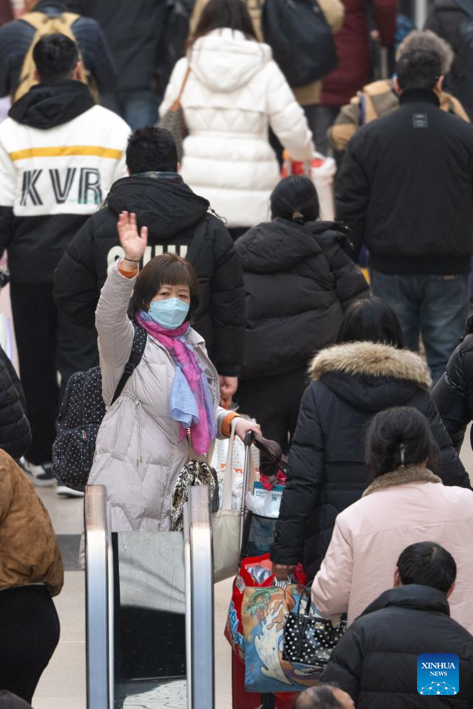 A passenger waves goodbye at Hankou Railway Station in Wuhan, central China's Hubei Province, Feb. 2, 2026. (Xinhua/Xiao Yijiu)
