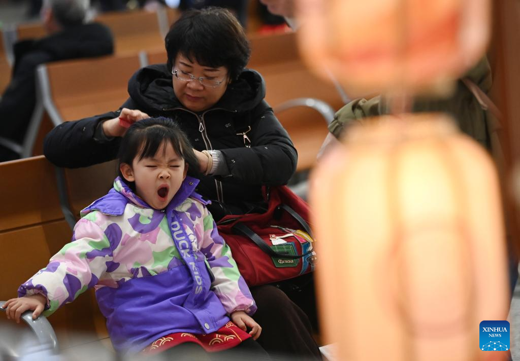 A woman combs a girl's hair at the departure hall of Xi'an Railway Station in Xi'an, northwest China's Shaanxi Province, Feb. 2, 2026. (Xinhua/Li Yibo)