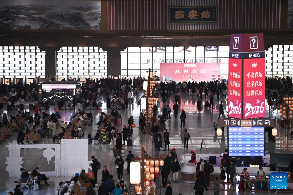 Passengers are pictured at the departure hall of Xi'an Railway Station in Xi'an, northwest China's Shaanxi Province, Feb. 2, 2026. (Xinhua/Li Yibo)