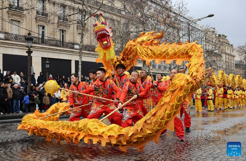 People perform a dragon dance during a parade celebrating the upcoming Chinese New Year on the Champs-Elysees avenue in Paris, France, Feb. 1, 2026. (Xinhua/Zhang Baihui)