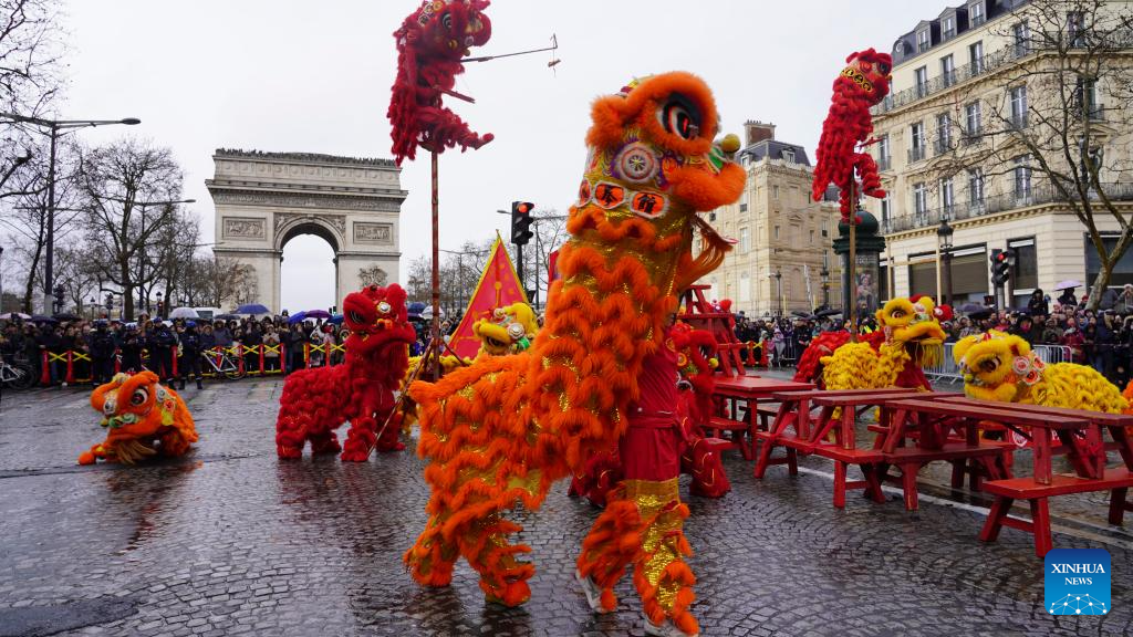 People watch a lion dance performance during a parade celebrating the upcoming Chinese New Year on the Champs-Elysees avenue in Paris, France, Feb. 1, 2026. (Xinhua/Cui Kexin)